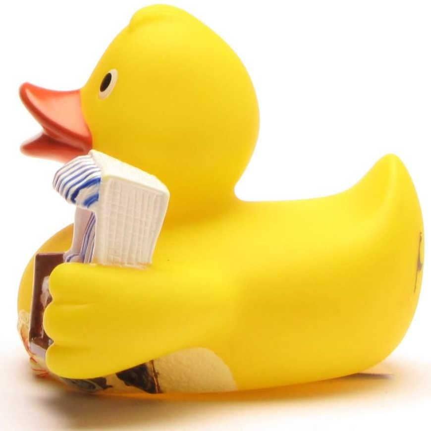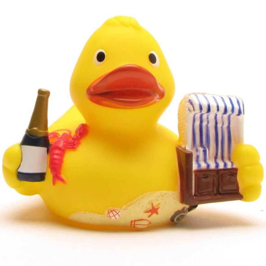 This sun-loving duck is all set for the perfect day at the beach! In one wing he’s carrying his trusty beach chair, ready to kick back and relax, while the other wing holds a chilled bottle of champagne for those seaside celebrations. Adding a splash of humour, a cheeky little lobster is climbing onto him, making this duck look like he’s really part of the ocean action. With sand and tiny seashells decorating the base, this duck captures all the charm of a warm, carefree beach day. A delightful addition to any collection!