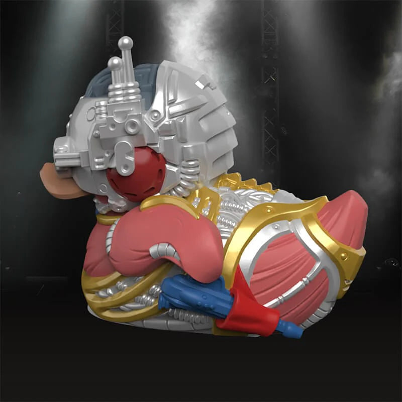 This collectible duck reimagines Eddie the Cyborg as a battle-hardened, part-machine warrior in classic duck form. His body is covered in sleek metallic plating with intricate cybernetic details — glowing circuits, exposed wiring, and mechanical joints that give him an unmistakably futuristic look. His one good eye glows red, while the other side of his face shows gleaming steel beneath torn “flesh.”